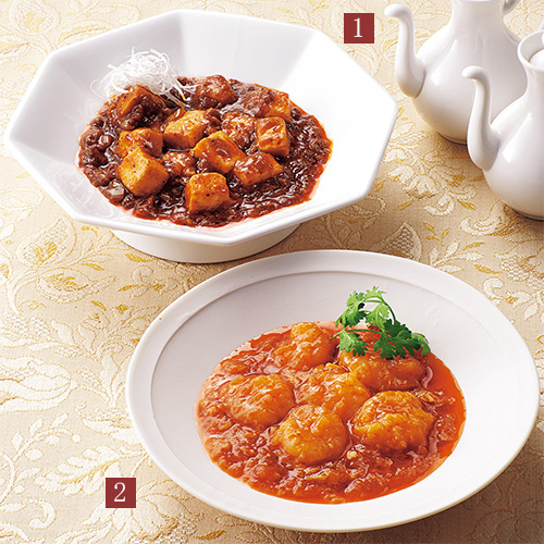 1.本格四川風麻婆豆腐/2.大海老のチリソース(エスサワダ/大阪府)