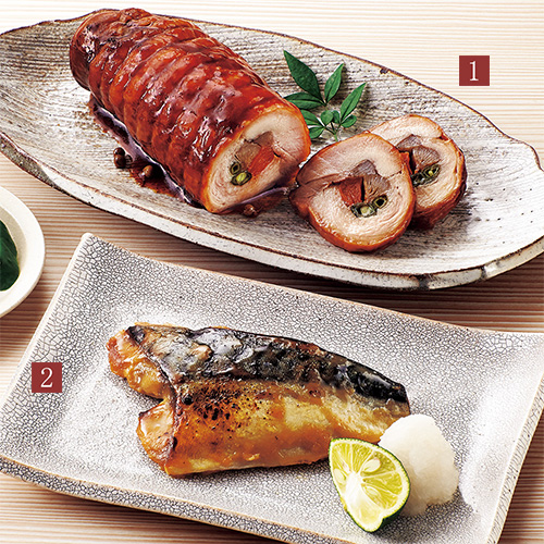 〔1〕は国産鶏もも肉で牛蒡、人参、いんげんを巻き、実山椒が爽やかに香る醤油ベースのたれで煮込みました。温めてスライスするだけで、おもてなしの一品に。〔2〕は和食の定番を名店の味に昇華させた西京焼。脂ののったさばを、甘味噌と西京味噌を合わせた味噌床で2日間漬け込み、香ばしく焼き上げました。上品な風味をお愉しみいただけます。