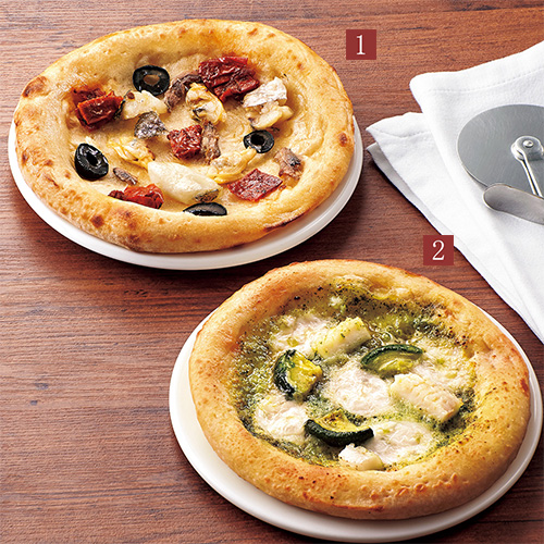 〔1〕はローストした鱈にアンチョビフィレとあさりを合わせました。イタリア産ドライトマトのやさしい甘みが全体を包み込みます。バジル香るジェノベーゼソースで仕立てた〔2〕は、ローストしたイカとズッキーニのグリルをのせ、チーズとともにとろける美味しさに。〔1〕、〔2〕とも主にイタリア産酵母を用い、二日間かけて熟成発酵させた生地を使用。小麦の豊かな風味を耳まで愉しめます。
