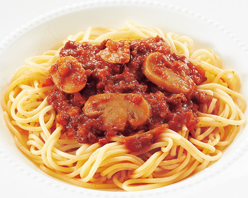 牛ひき肉と玉ねぎを、仔牛の肉や骨でとっただし汁、フォン・ド・ヴォーでじっくり煮込んで仕上げた濃厚なミートソース。牛ひき肉の食感とやわらかめに茹でたスパゲッティとの相性は秀逸。隠し味にウスターソースや赤ワインを使用した本格的な一品です。