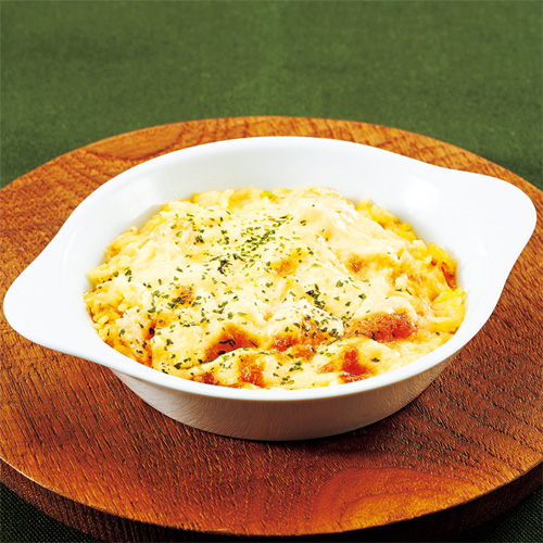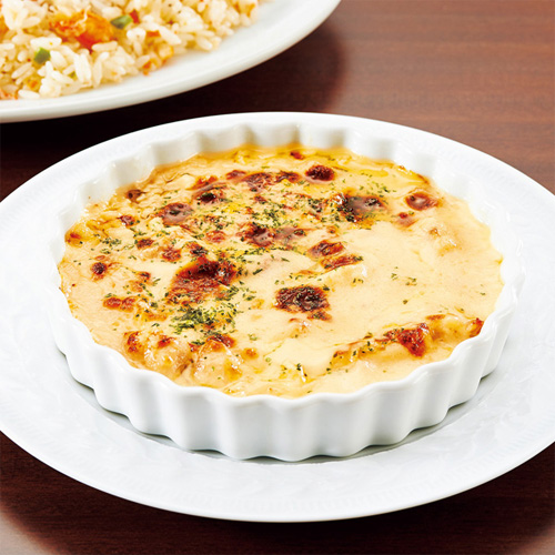 ごろっとした鶏肉と玉ねぎ、マッシュルームを炒めて白ワインで煮込み、バターを用いた濃厚なホワイトソースと合わせた、手間ひまかけたひと皿。シュレッドチーズやパルメザンチーズのとろける香りが食欲をそそり、おかずにもお酒のおつまみにも最適です。