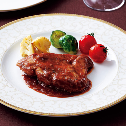 香ばしく焼き目をつけて旨みを閉じ込めた鶏肉に特製デミグラスソースを合わせて仕上げた、パーティにおすすめの豪華な一品です。鶏肉は程よい弾力がありながら、ナイフの刃がすっと通るほどやわらかく仕上がっており、じっくり炒めた玉ねぎの甘みが溶け込んだソースとの相性も格別。ボリュームがあり食べ応えも十分です。