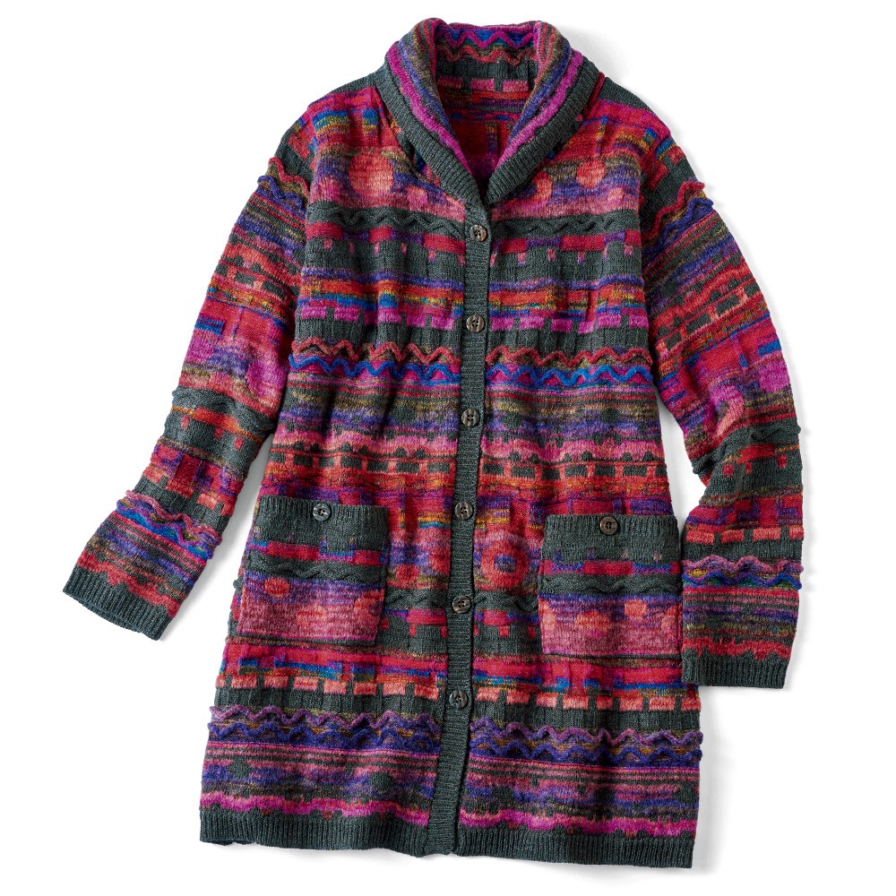 多彩な色と柄を重ねた、印象的なロングカーディガン。