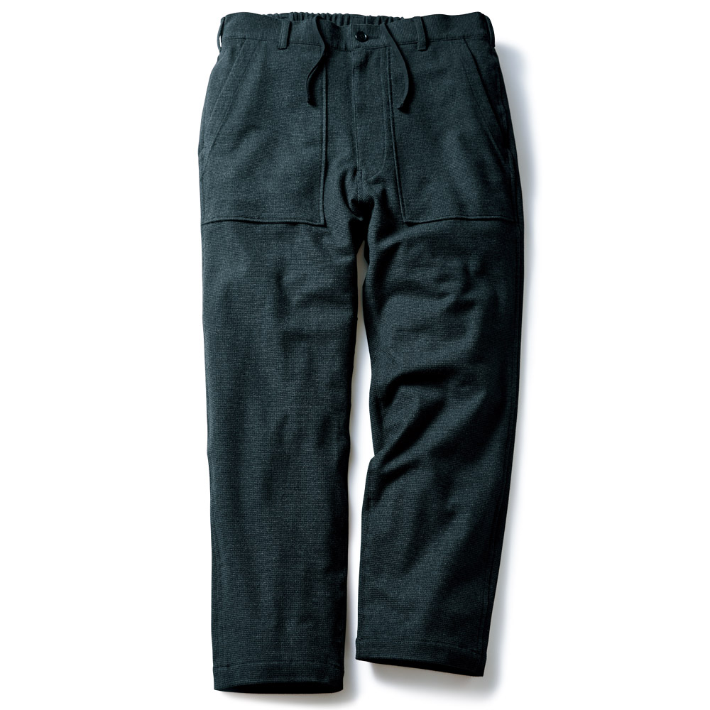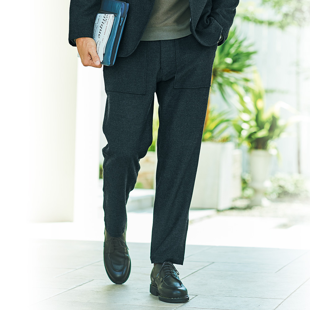- 日常で気軽にはけて仕事にも対応できるオンオフ兼用のパンツを〈サージュデクレ〉のデザイナー、千田仁寿氏にリクエスト。素材は「+3度」の温感効果を発揮するといわれる吸湿・発熱素材を採用。ウールツイードのような風合いと、遠目にはほとんど無地に見えるチャコールグレー系マイクロ千鳥格子の色柄が上品な雰囲気です。しかもジャージー素材のようにストレッチするので、動きやすく軽快なはき心地を楽しめます。ミリタリーのベイカーパンツをベースに、程よいカジュアル感を演出。ウエスト背面をゴムシャーリングにしたイージーパンツ仕様ながら、普段の外出から旅行、ビジネスまで、さまざまな場面でスマートにはきこなせます。
