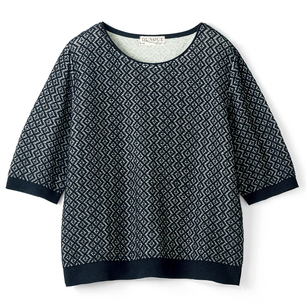 - 南ドイツの小さな村にあるニットメーカー〈ドゥンクエ〉から届いた、シンプルでモダンな黒のニット。菱形の幾何学模様を洒脱に表現した編み柄が、程よく開いた襟ぐりとゆとりのあるシルエット、肘にかかる五分袖と相まって上質なリラックス感を演出します。