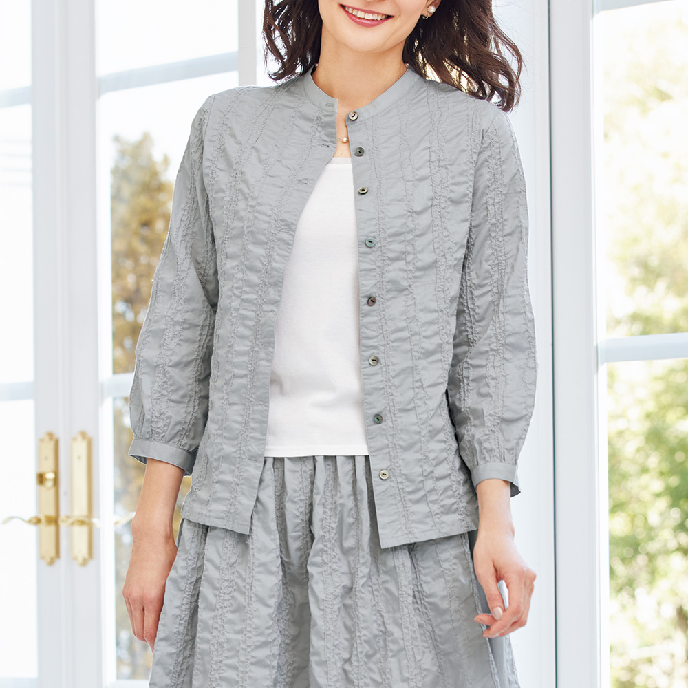 - 生地のユニークな表情がお洒落さを醸すブラウス。肌触りのよいコットン100%の生地にステッチを施し、ストライプのようなラインを立体的に表現しているのが特徴です。ステッチによって生地が収縮してシワが生まれ、より複雑な陰影を落としているのも魅力。ラベンダーがかった淡いグレー1色の生地でありながら、風趣豊かな表情を生み出しており、装いを華やかに演出してくれます。小さめのスタンドカラーがすっきりとした印象。袖口はギャザーを寄せ、幅の狭いカフスをあしらって愛らしく仕上げました。裾両脇にはスリットが入っており軽快な雰囲気。汗ばむ季節の羽織り物としても活躍します。上品なグレーの色合いが合わせやすく、幅広いコーディネートに活躍できます。