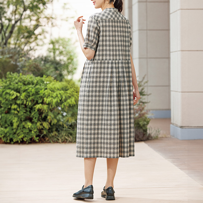- 大人の可愛らしさが薫り立つ格子柄のプリントワンピース。ミラクルウェーブ加工を施した生地は表面に凹凸があり、肌離れがよく着心地は涼やかです。ウエスト切り替え下のタックからふんわりと広がるシルエットは、共布のリボンでメリハリをつけられるのも魅力。前面ファスナーがウエストの下まで開いて着脱しやすいのも嬉しいポイント。首元をすっきりと見せるマオカラーに二の腕が隠れる長めの半袖など、細部までこだわった一着です。