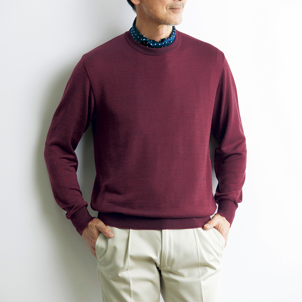 素材の魅力を最大限に引き出す技術と、端正な仕立ての服作りに定評のある〈林田〉。こちらは、シルクの美しい艶や滑らかさといった素材の表情が際立つセーター。薄手で柔らかく、滑らかな肌触りが味わえます。それぞれ日本の伝統色を基調にした2色で細かなバーズアイ調の柄に編み上げ、複雑な色彩ながら無地感覚で着られます。