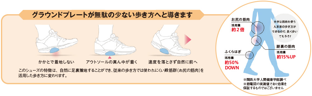 - 足裏着地を促すことで地面からの、衝撃をお尻や太ももの筋肉へと分散。