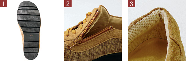 - 一度靴紐で調節すれば、サイドファスナーにより脱ぎ履きが楽々。