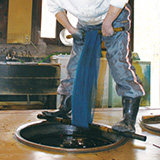天然染料として古くから人々の暮らしを彩り、珍重されてきた藍。その魅力に着目し、江戸時代から伝わる「天然藍灰汁醗酵建」の古法を今に受け継いできたのが、大正8年創業の藍染め工房〈壺草苑〉です。原料に阿波徳島産の天然藍を使用し、灰汁の上澄み液やふすま、清酒などを用いた「灰汁醗酵建て」による、化学薬品を一切使わない、昔ながらの染色方法にこだわっています。深みある美しい色合いが特徴です。