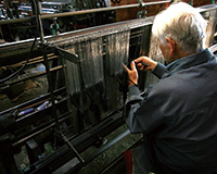 尾州の老舗「三星毛糸」。今回の生地は、昔ながらのションヘル織機を使いゆっくりと時間をかけて丹念に織り上げています。写真は糸を織機に通す職人の様子。