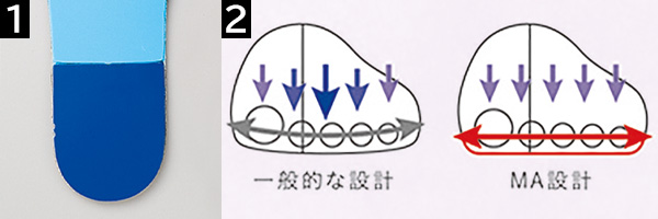 インソールのかかと部分全体に「ソルボセイン」を配し、広い面積で歩行をサポート。 - 【2】アキレスの木型「メディフラット・アナトミー」