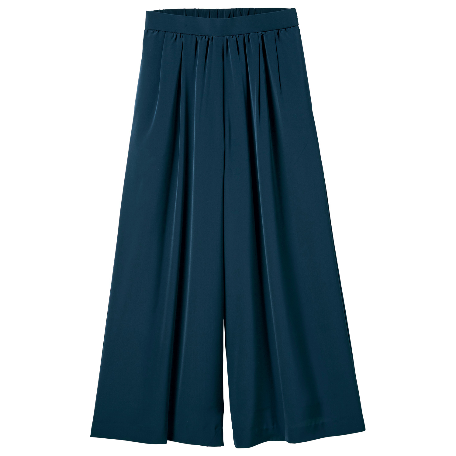 動きやすさとフェミニンさを兼ね備えたガウチョパンツは、いわばワイドパンツとフレアスカートのいいとこどり。スカートのようなボリューム感を持ちながら、脚をすっきりと見せてくれるシルエットが人気で、動きやすさも魅力の一つです。こちらは、落ち感の美しい生地の質感を生かしたガウチョパンツ。程よいゆとりを持ち、裾の広がりもワイド過ぎず上品です。タックを入れることでエレガントなシルエットが生まれ、ウエストやヒップなど気になる体形をカバーしながらモダンな着こなしが愉しめます。ウエストは背面ゴム入りで、締めつけ感が軽減されるのではき心地も快適。大人の女性にぴったりの落ち着いた雰囲気で、組み合わせるアイテムの色使いやパターンによって幅広い表情が演出できます。ご自宅で気軽に手洗いできるのもうれしいポイントです。