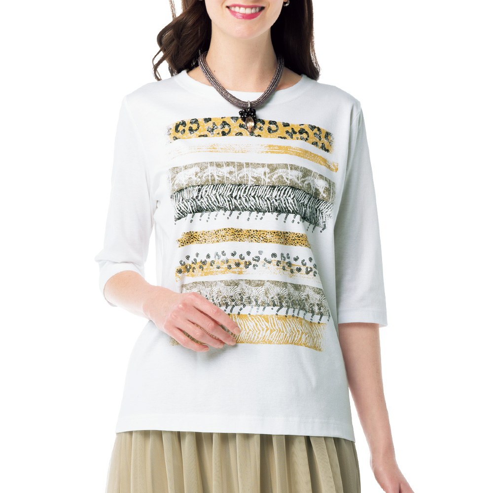 ヒョウ柄やゼブラ柄などをスパンコール刺しゅうとプリントで表現したTシャツ。シックな色使いとスパンコールの光が大人に似合う上品な存在感を放ちます。肘が隠れる袖丈も嬉しいポイント。インナーとしても胸元に華やぎを添えてくれます。