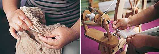 羊毛の特性を活かすのに欠かせない作業が「手紡ぎ」。ふかふかとした理想的な糸をつくるには、均一に紡ぐ機械生産ではなく、毛の質を見極めつつ力加減を微妙に調節できる「手紡ぎ」が肝腎です。