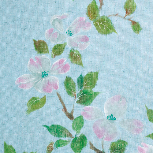 - あたかも晴天の空にハナミズキが美しく枝を伸ばしているかのような、清々しさに満ちた図柄が魅力である「手描き麻のれん」。ご紹介するこちらは、のれんの図柄としては意外と目にすることの少ないモチーフ、ハナミズキを題材にしています。ハナミズキはアメリカヤマボウシとも呼ばれ、花の美しさから街路樹や庭木として愛されている落葉高木。爽やかな浅葱色ののれん地にハナミズキが美しく映え、ほのかにピンク色に染まった花弁がなんとも優美な印象です。描いたのは京友禅・手描部門、引染の伝統工芸士、山森美紀氏。2014年の全国伝統的工芸品公募展で入選以来、16年、19年と京手描友禅作品展入賞の実績を誇る俊英です。麻地の透け感も味わい深く、間仕切りとしてはもちろん、洋間にタペストリーのように掛けるのもおすすめです。
