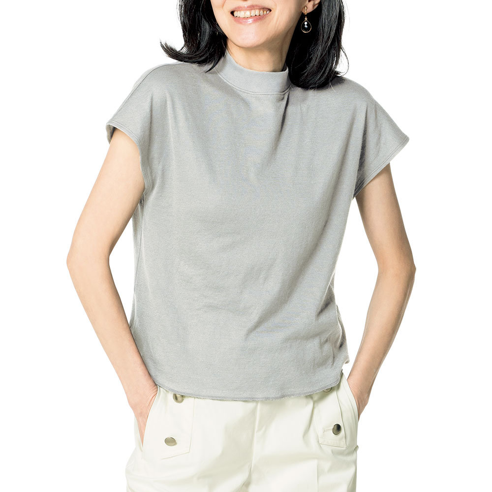 - ガーゼのようなふわふわの肌ざわりにホッと和む一枚。甘く撚った糸で編んだガーゼ調の接結天竺生地を用いた柔らかプルオーバー。モックネックやフレンチ袖が首元や肩口を上品にカバー。舟形の裾ラインで短めの着丈が洗練の着こなしバランスを演出します。