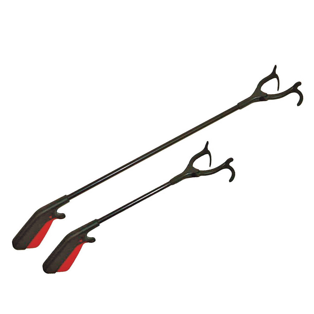 ちょっと離れた場所にある小物などを取る時に便利な「お助けハンド」。軽量で丈夫な素材を使用したこちらは、挟む部分にラバーが付いていて、小銭やティッシュなど薄いものもしっかり挟めます。引っかけて取れるフック付きなのも便利。持ち手は大型で握りやすく、先端は約90度ずつ回転させられるため、挟む角度に合わせて無理に手首をひねる必要もありません。細身で棚の隙間に落ちた物を拾う時にも重宝します。