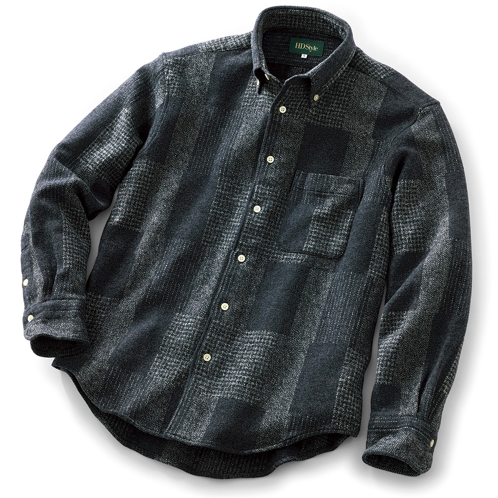 装いにアクセントを添える一着として当社でも人気の、パッチワーク風チェック柄のシャツ。ドビー織機で織った二重織りのツイル生地は、適度な厚みとふくらみがあるうえ、両面に起毛を施しているので、肌触りもよく、ウールを思わせる暖かさ。コートの下に着てもよし、アウターとして着てもよし。汎用性の高い重ね着アイテムとして春先まで活躍します。