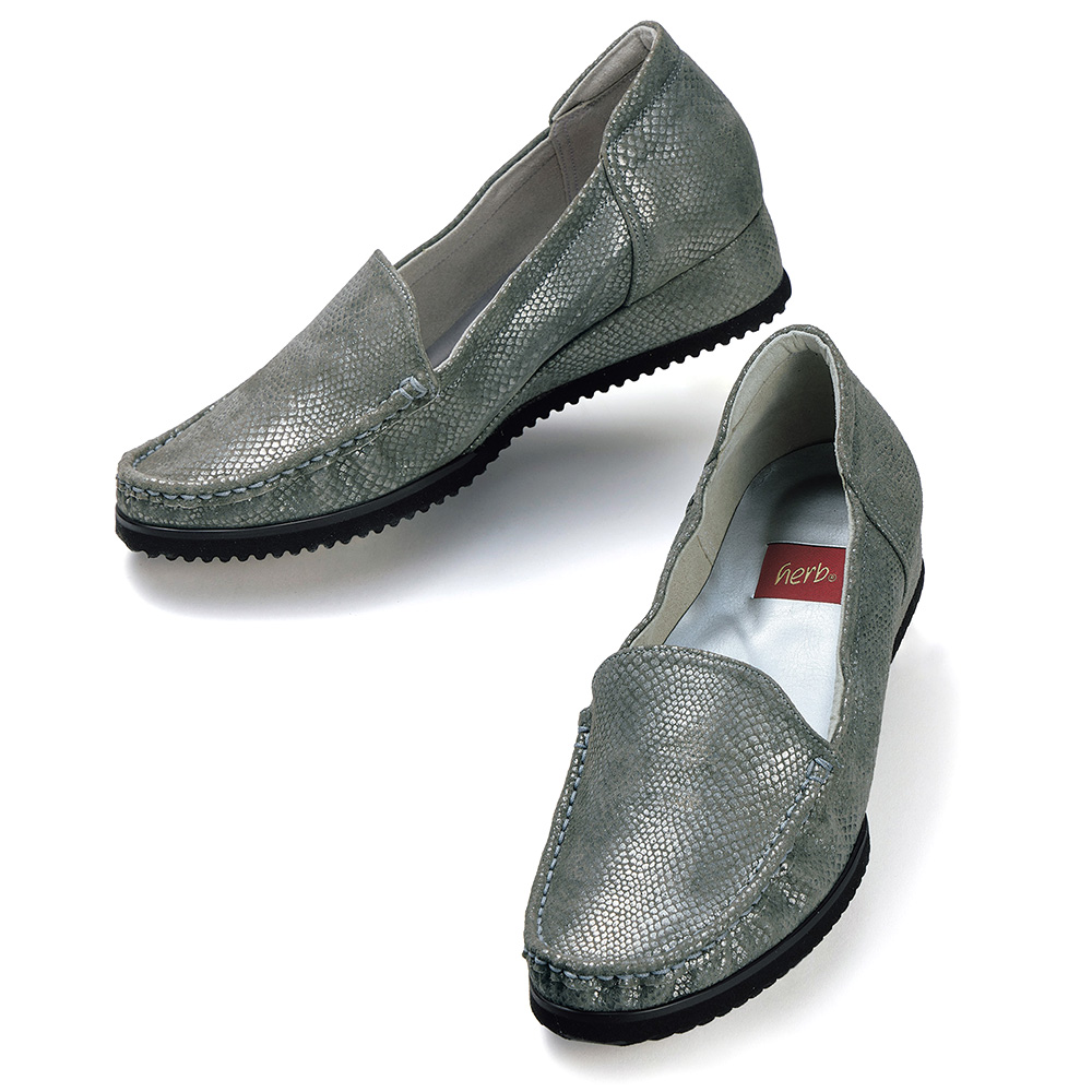 - 柔らかなシボ革と履き口のギャザーが足を優しく包み込むような履き心地の一足。つま先が少し上がったウエッジソールや立体的なインソールが歩きを快適にサポート。足囲4Eでゆったりとしていながらスマートに見えるのも魅力です。