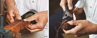 江戸時代より続く棕櫚産業の技術を受け継ぐ〈髙田耕造商店〉。繊維の状態を指先で感じ、職人の勘で調整しながら製品を作り上げます。