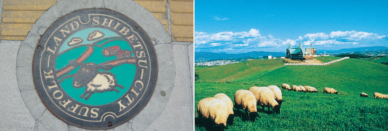 士別市郊外の幾重にも連なる丘陵地の中心に立つ「羊飼いの家」からの眺めは絶景です。360度に展開される大パノラマと清々しい大気は、この場所でしか味わえません。緑の絨毯のような大地、高くあくまでも碧い空の下、のどかに草を食む羊の群れは絵画の世界のよう。左の写真は駅前で見つけた珍しいマンホールの蓋。愛らしい羊が出迎えてくれます。