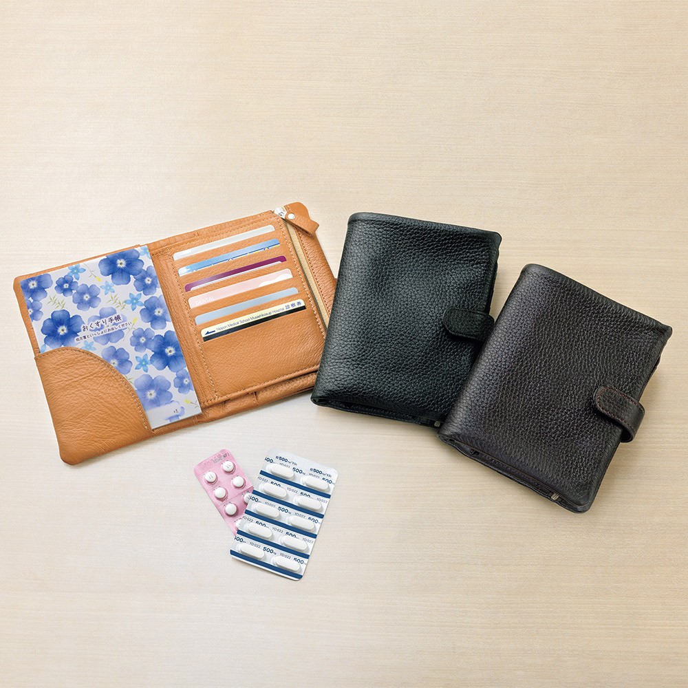 | 仕様 | スナップボタンによる開閉/内側にカード入れ6ヵ所、オープンポケット4個、ファスナー付メッシュポケット1個、あおりポケット(お薬手帳用)1個、札入れ(間仕切り付)1ヵ所 |
