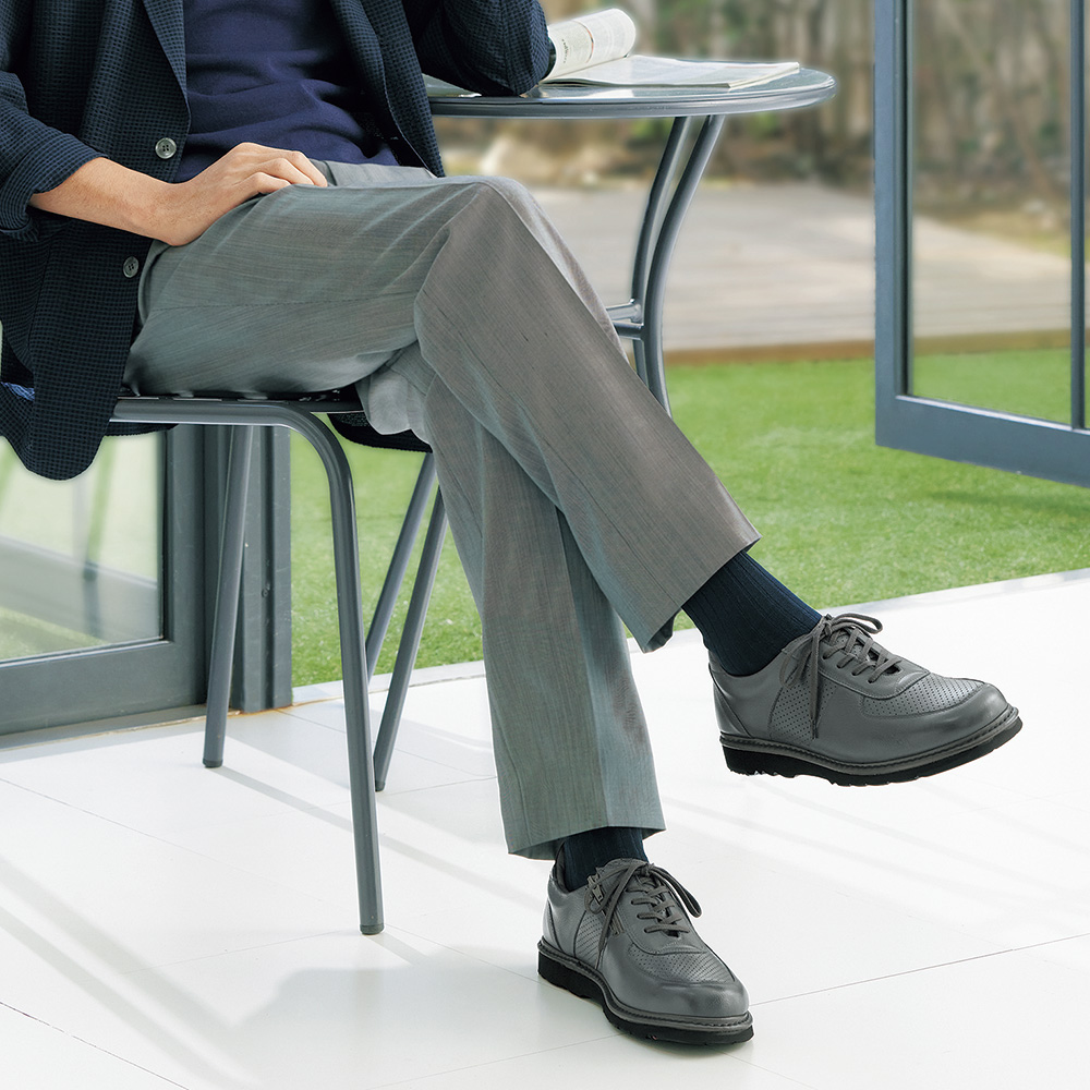 - 1974年の創業以来、国産本革を使った靴作りを行う〈金谷製靴〉。品のよいデザインからは予想もできないほどに柔らかな履き心地のレザースニーカーで評判です。ご紹介するのは紐靴タイプの一足。天然のシボが味わい深いソフトレザーを使用。レースアップの端正な表情ながらパンチングやステッチで程よくカジュアル感を添えたデザインが魅力です。パンチングに加えてライニング(内張り)のメッシュや高通気のウレタンインソール、アウトソールの通気孔など数々の工夫で革靴ながらムレにくい履き心地を実現。足囲は4Eで足指の締めつけが少なく快適です。三層構造のソールが優れたクッション性で歩きやすさをサポートしてくれます。