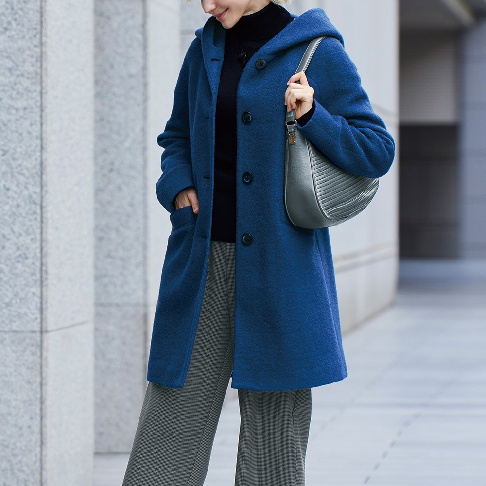 軽やかなウール混の縮じゅう生地で仕立てた、シックなダークネイビーのフーディコート。気軽に羽織れる定番のシルエットながらも、表面にループ糸が浮かぶ表情のある質感、大きめのフードや斜めに配したポケットが、フェミニンさをプラスしています。