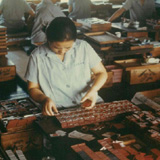 昭和中期頃、旧社屋で行われていた花札の検品風景。