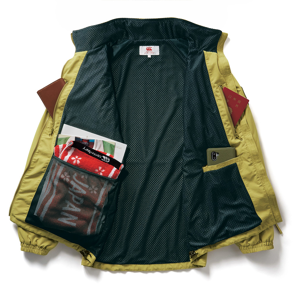 長年のラグビージャージー作りで培った〈カンタベリー〉の技術を活かして作り上げた当社限定のトラベルブルゾンです。シルキーな光沢を持つ表地は、撥水性を備えた丈夫なナイロンでありながら、コットンのような柔らかな肌あたりを実現。襟裏や身頃裏は保温性を備えた光電子素材の起毛メッシュで、遠赤外線効果により程よい温もりで身体を包みます。計7個のポケットを備え、旅先での手ぶら歩きも可能です。充実した機能とシンプルで飽きのこないデザインで、大人の旅を支えます。